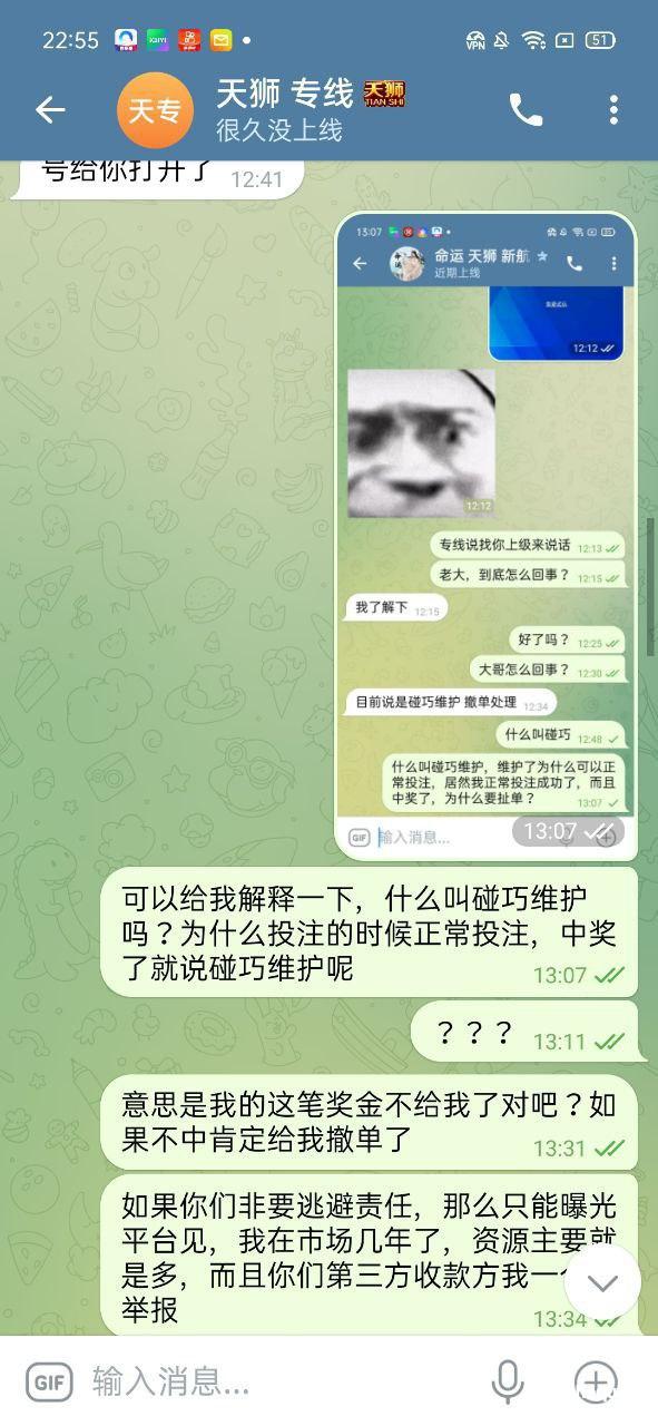 本人今年3月份在天狮娱乐打新澳门六合彩亏了8万,8月13号登陆平台账号有130块钱玩了一下平台的奇趣腾讯qq分分彩,买了三星复式单挑中奖了,差不多奖金九千多,平台直接给我撤单,找了专线和上级,专线和上级都说是碰巧维护,我投注的时候没有维护正常下注的。结果中奖了平台给我来了句,碰巧维护撤单处理,我要求平台给我奖金,不但不给反而把我账号给冻结了。大家记住天狮这个杀猪盘,只能输不能赢,中奖就撤单,而且冻结账号。希望有高层出来处理这个问题,黑了九千多块钱,如果没人才处理,就一直曝光,曝光到你们有人出来处理。