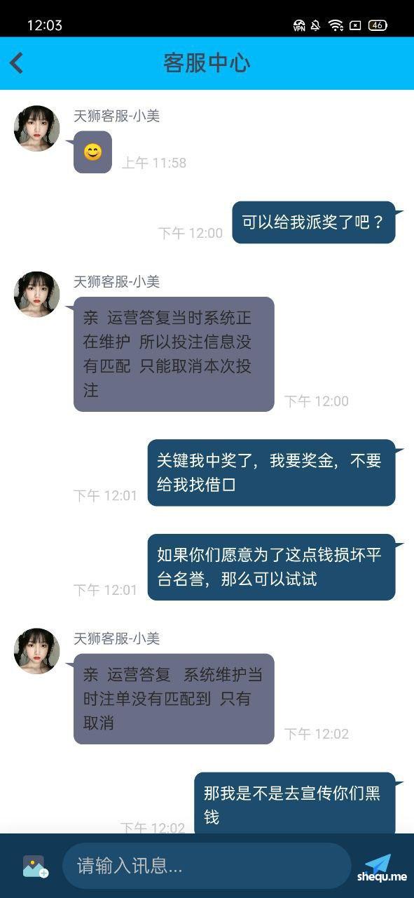 本人今年3月份在天狮娱乐打新澳门六合彩亏了8万,8月13号登陆平台账号有130块钱玩了一下平台的奇趣腾讯qq分分彩,买了三星复式单挑中奖了,差不多奖金九千多,平台直接给我撤单,找了专线和上级,专线和上级都说是碰巧维护,我投注的时候没有维护正常下注的。结果中奖了平台给我来了句,碰巧维护撤单处理,我要求平台给我奖金,不但不给反而把我账号给冻结了。大家记住天狮这个杀猪盘,只能输不能赢,中奖就撤单,而且冻结账号。希望有高层出来处理这个问题,黑了九千多块钱,如果没人才处理,就一直曝光,曝光到你们有人出来处理。